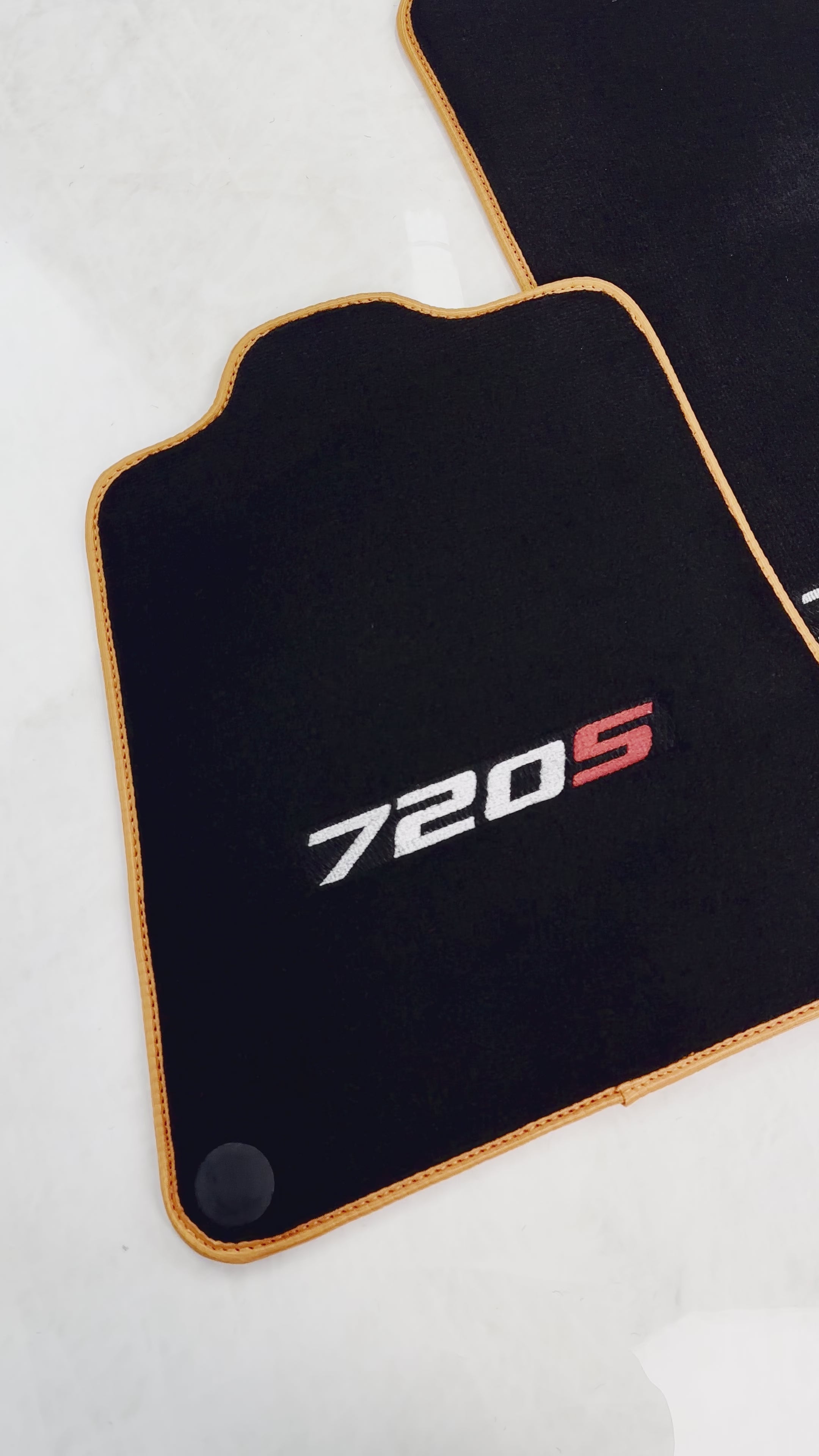 Expertly tailored for your McLaren 720S, these black floor mats with orange trim not only add a touch of style to your car's interior, but also provide exceptional protection against dirt, spills, and wear and tear. Made with precision and high-quality materials, these floor mats will elevate your driving experience.