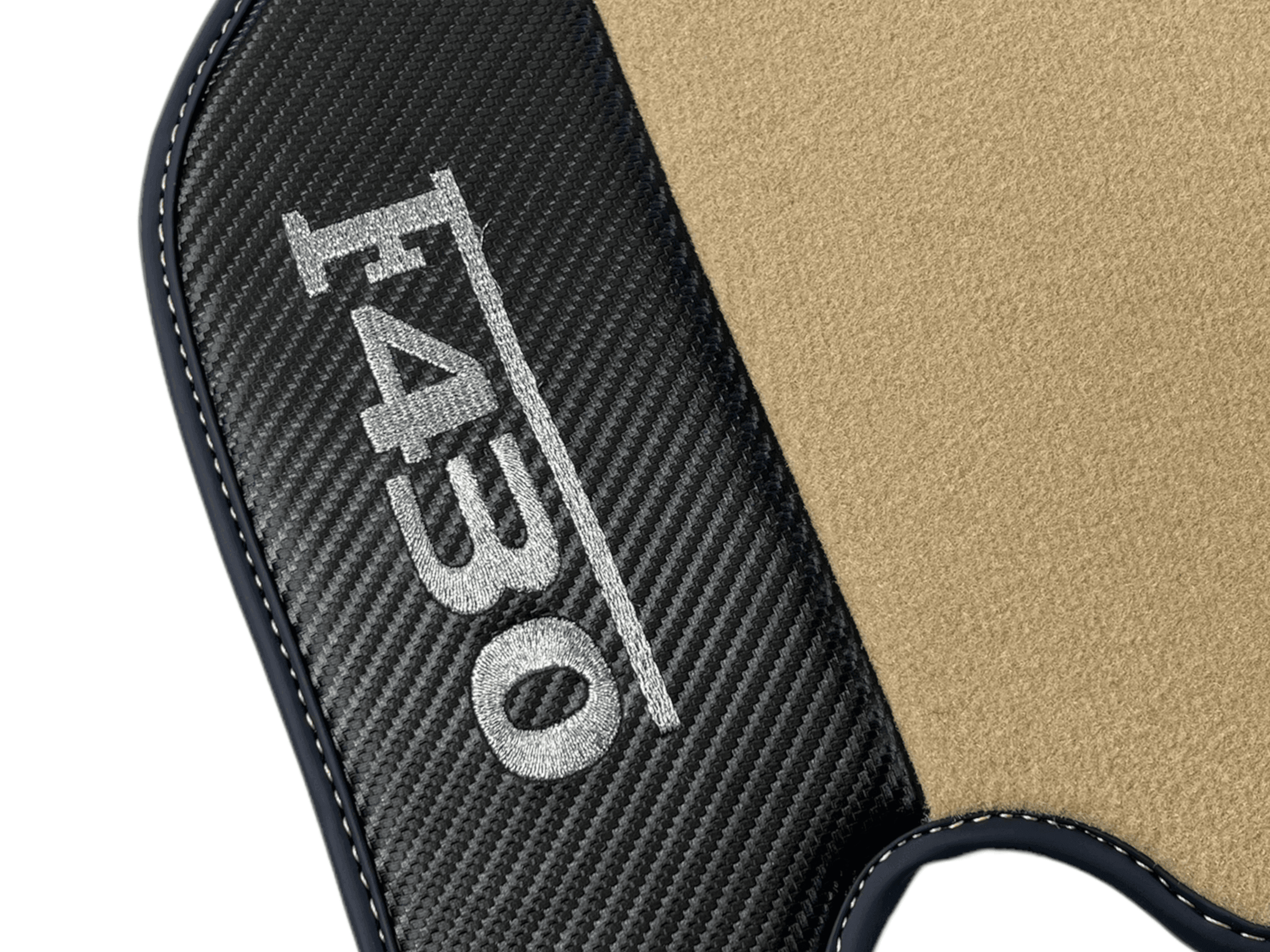 Expertly crafted for the Ferrari F430 2004-2009, these Beige Floor Mats boast a sleek and durable design made with Carbon Fiber Leather. Experience superior comfort and protection for your car's interior, while adding a touch of luxury. Elevate your driving experience with these high-quality mats.